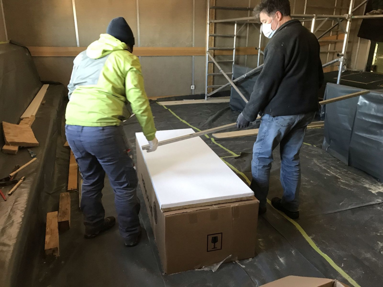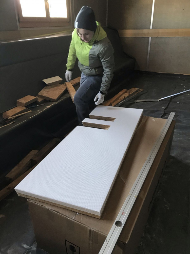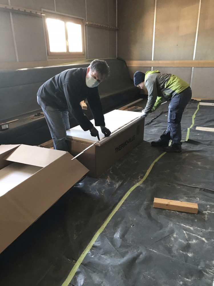 Trotz dem richtig kalten Wetter wurde beinahe die koplette Deckenisolation neu montiert. Gearbeitet wurde dabei mit weissen Handschuhen damit alles weiss blieb.