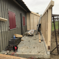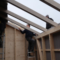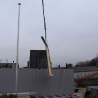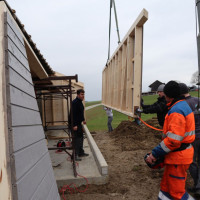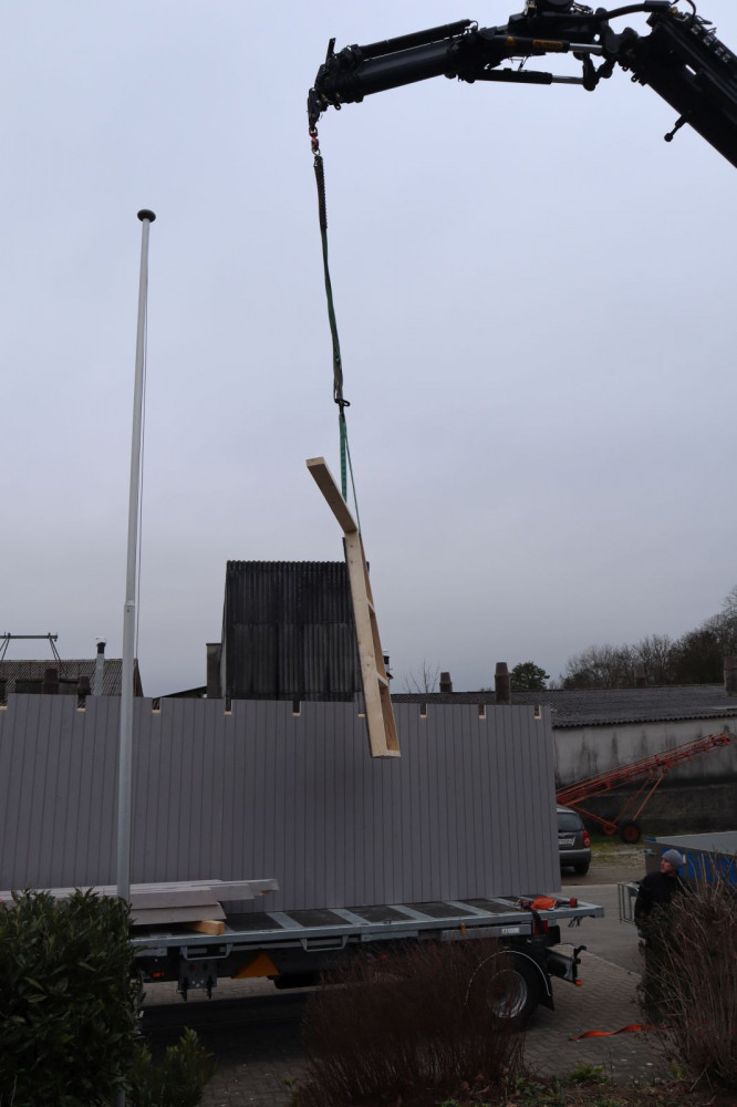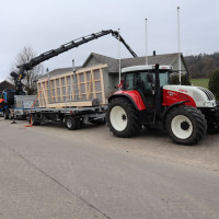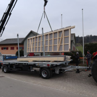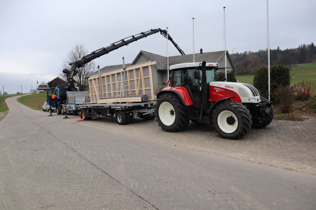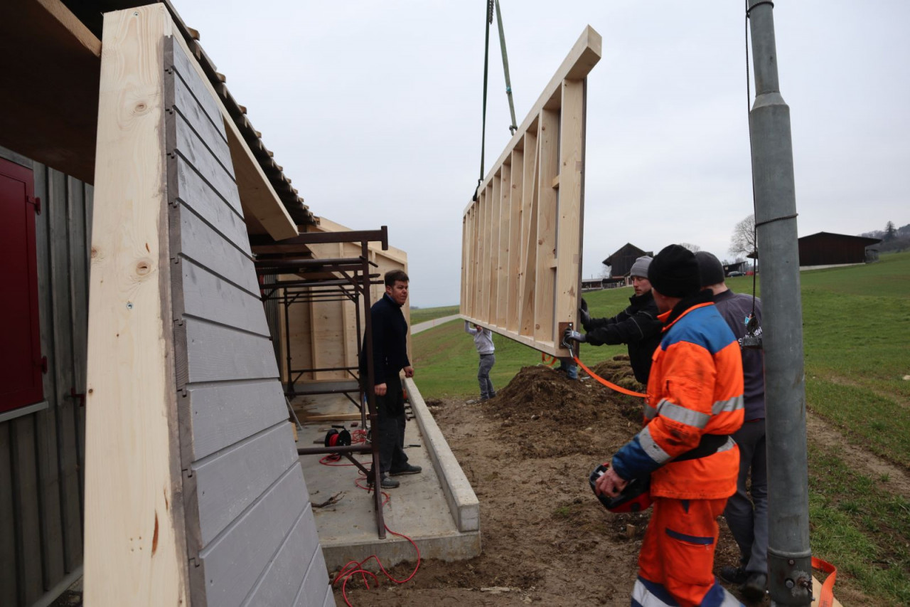 Heute war die Montage des Anbaus auf dem Programm. Die starke Bise half nicht gerade, aber der Chauffeur von Huber Transport hatte seinen Lastwagenkran voll im Griff und alles konnte ohne Probleme montiert werden.