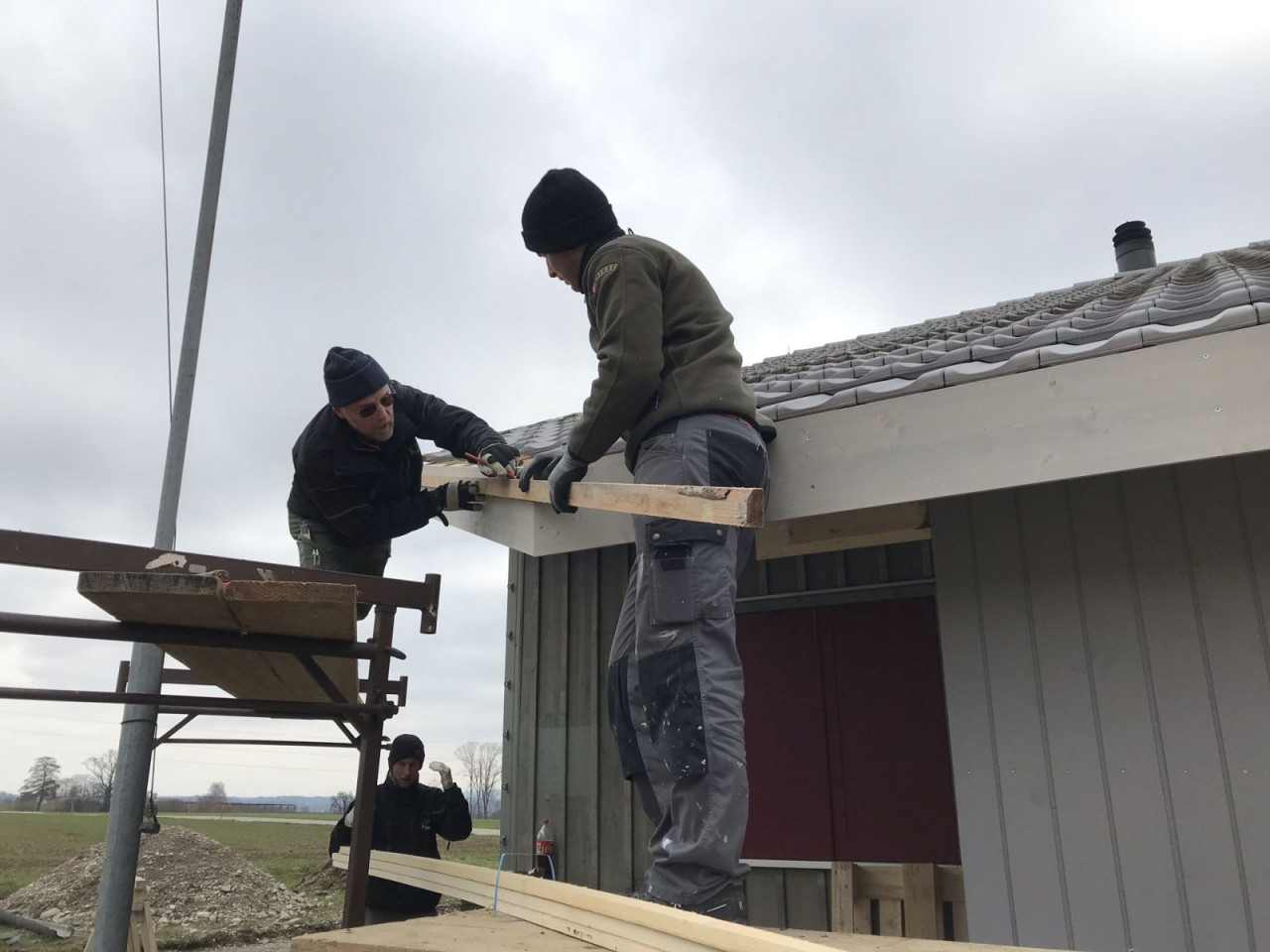 Die Arbeiten machen weiter Fortschritte. Der Anbau ist bereits gedeckt und die Decke im Schiessraum ist schon weit gediehen.