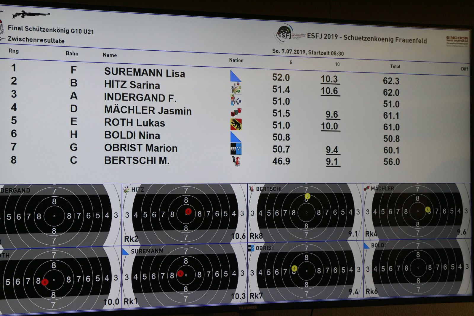 Sarina startet um 08:30 zu ihrem Final. Die ersten 5 Schüsse gelangen mit 51.4 Punkten gut, die nächsten gelangen mit 50.0 Punkten nicht mehr ganz so gut. Sie musste zu viele Schüsse mit einer 9 hinnehmen und die hohen 10er fehlten. Wie eng es war zeigte sich dass nach 14 Schüssen von Rang 3 bis 6 alle 141.6 Punkte hatten. Am Schluss fehlten 1.4 Punkte für das Podest.