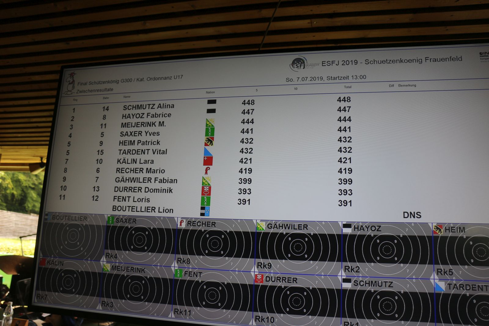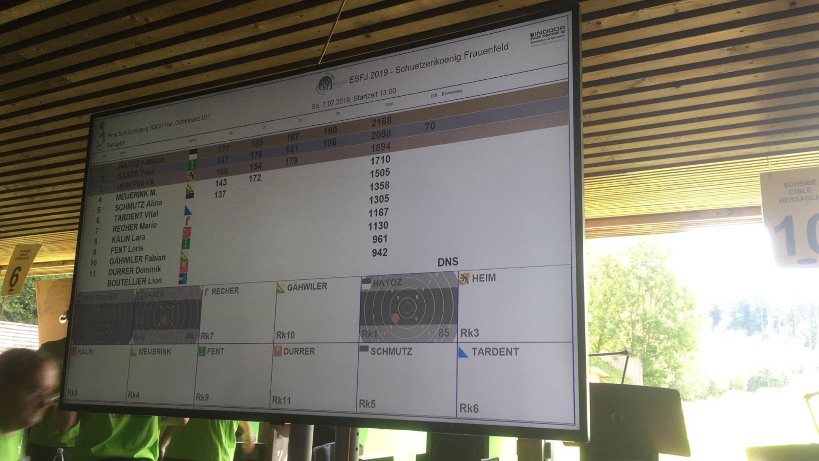 Marvin startet um 13.00 zu seinem Final. Mit 444 Punkten nach 5 Schüssen war er nur 4 Punkte hinter dem führenden. In den zweiten 5 Schüssen zog dann der spätere Gewinner Fabrice Hayoz mit sagenhaften 481 Punkten davon. Marvin war mit seinen 429 Punkten immer noch auf Podestkurs. In den nächsten 4 Schüssen war eine 99 dabei aber leider auch drei in den ziebziger. Das auf und ab ging weiter und so fehlten am Schluss 5 Punkte auf das Podest.