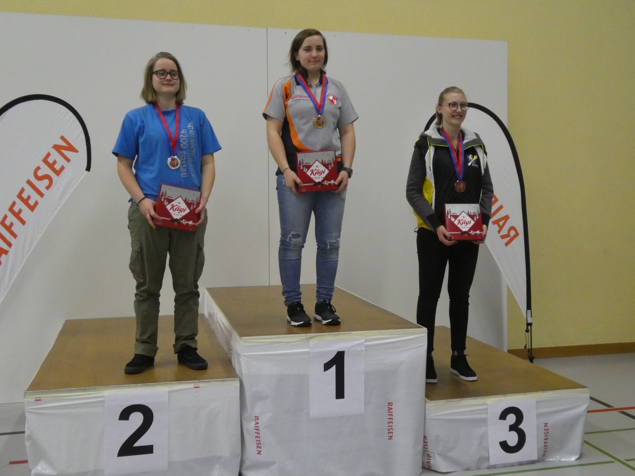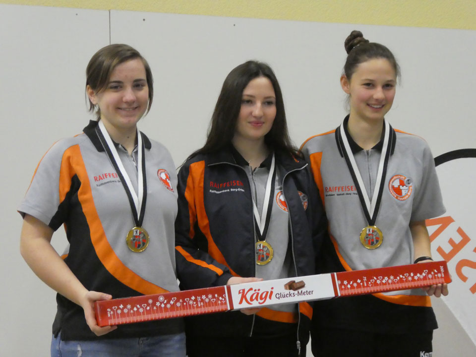 Gespannt waren wir auf das Abschneiden der U21-Gruppe mit Cheyenne, Sarina und Seraina, belegten sie doch nach der Qualifikation den 1. Rang. Cheyenne startete ganz ordentlich, hatte aber in der dritten von vier Passen mit 87 Pkt. einen Durchhänger. Dennoch kam sie auf gute 366 Pkt. Seraina bekundete lediglich mit der ersten Passe mit 90 Pkt. etwas Mühe. Dann folgten mit 96 / 95 / 95 drei starke Passen und sie beendete den Wettkampf mit sehr guten 376 Pkt. Sarina ihrerseits zeigte von Beginn weg einen tollen Wettkampf und schoss mit Passen von 98 / 100 / 99 / 98 und einem Total von 395 Pkt. einen starken Wettkampf. Wie stark diese 395 Pkt. von Sarina zu werten sind, vermittelt auch die Einzelrangliste, in der die zweitplatzierte Marlies Kaiser nicht weniger als 10 Pkt. Rückstand aufweist. Und mit dem Gesamttotal von 1137 Pkt. wurde unsere U21-Gruppe ihrer Favoritenrolle gerecht und durfte sich die Goldmedaille umhängen lassen.